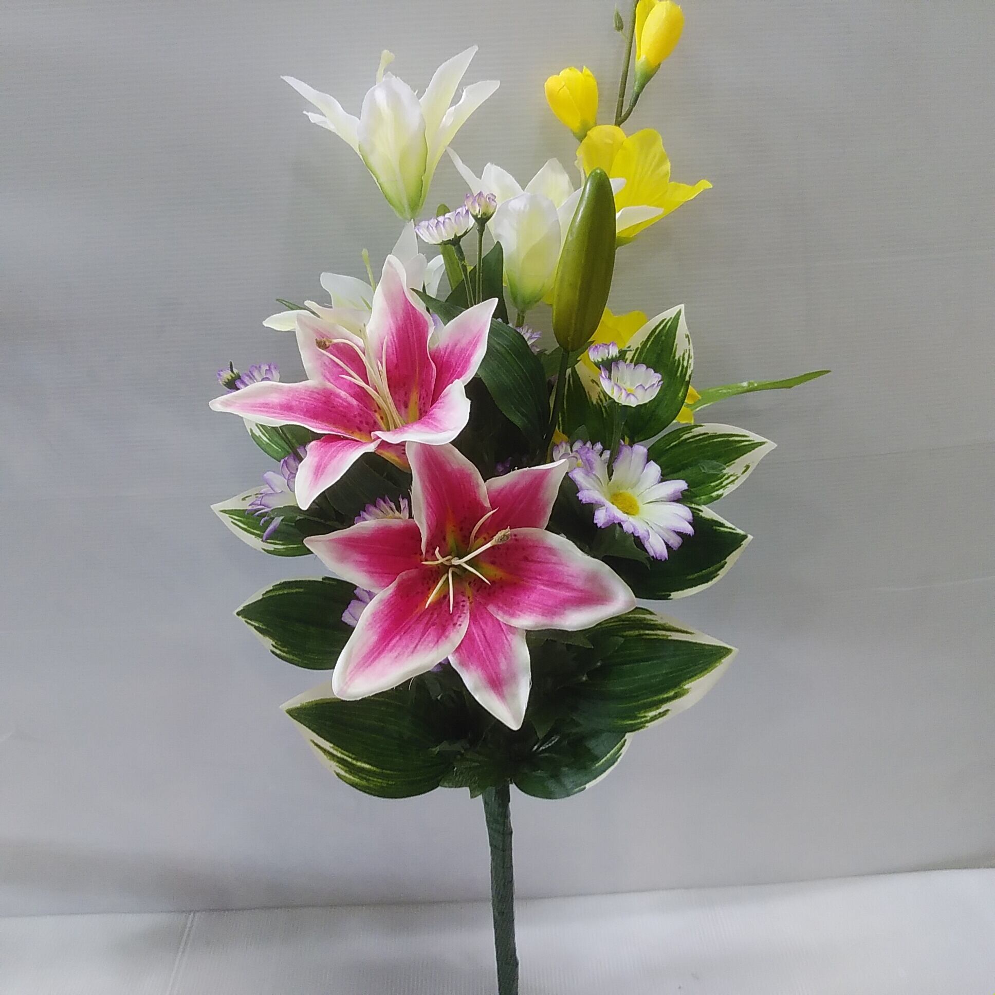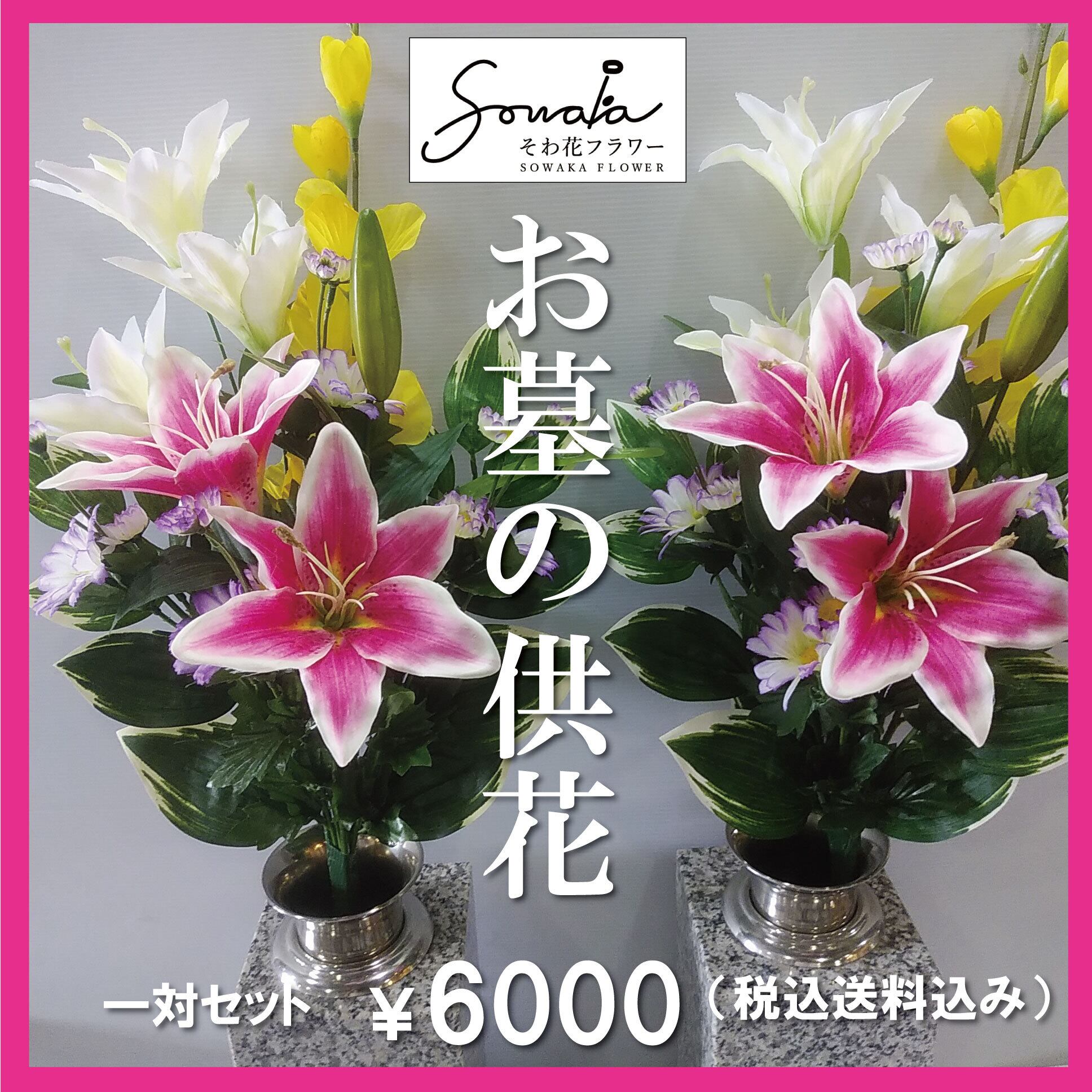夏本番で、もうすぐお盆ですね。 こんな暑さの中ではお墓の生花は3日も持ちません。 お盆の御供花には造花をお勧めします。 そわ花は、人工的な花ではなく、生花と同じように鮮やかな色合いや自然な風合いを持つことを大切にしています。 ピンクのユリをメインにした明るい色彩の組み合わせです。 一般的なお墓の花立てにぴったりフィットするサイズです。 ■サイズ:高さ約65cm × 幅約30cm (深さ20~25cmの一般的な花筒にフィット) ■造花種類 5種類