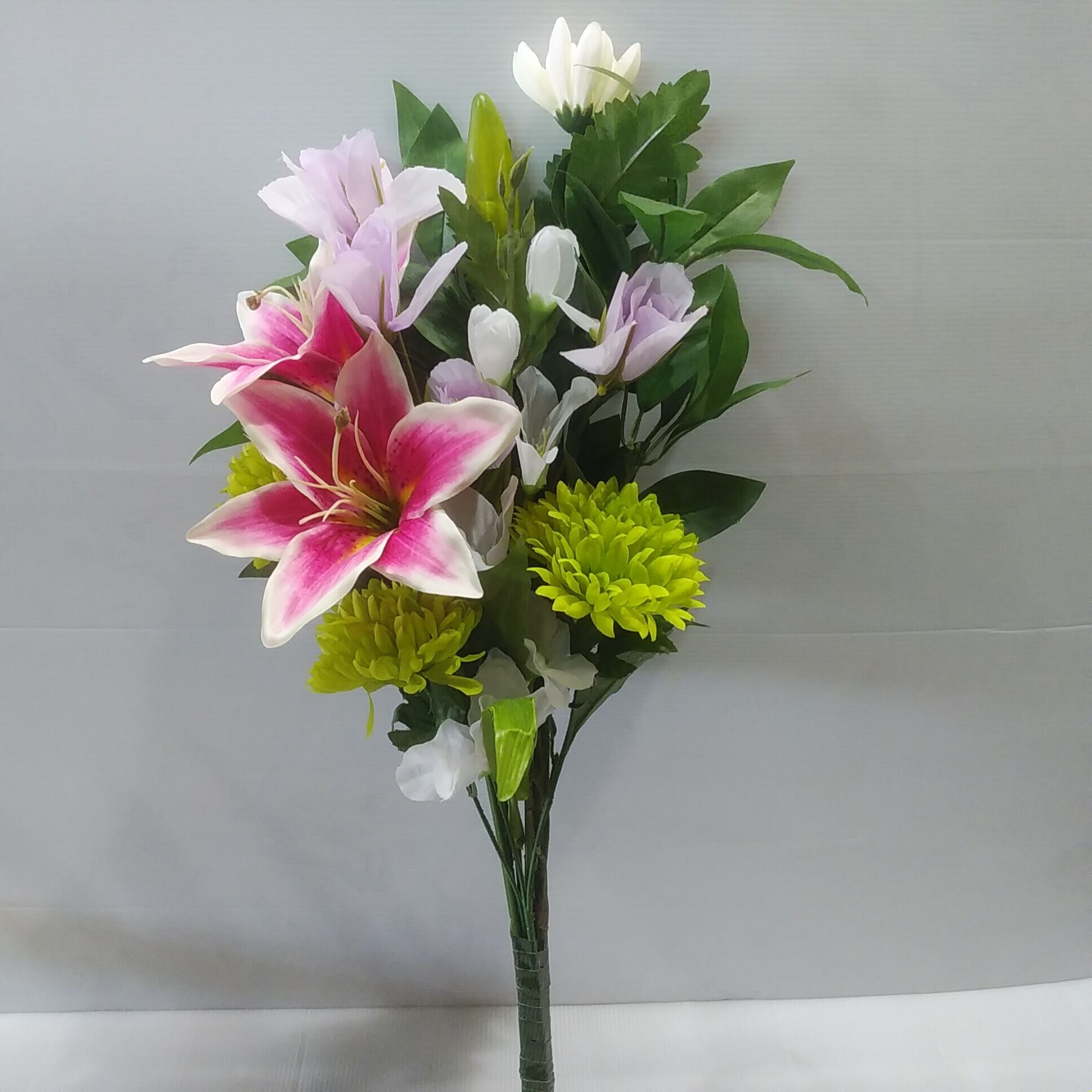お盆のお墓参りに最適な墓石用のアーティフィシャルフラワー。 生花ではすぐに枯れてしまいますが、造花なら華やかさが保てます。 紫色が印象的な造花の供花1対セットです。 一般的なお墓の花立てにぴったりフィットするサイズです。 ■サイズ:高さ約65cm × 幅約25cm (深さ20~25cmの一般的な花筒にフィット) ■造花種類 6種類