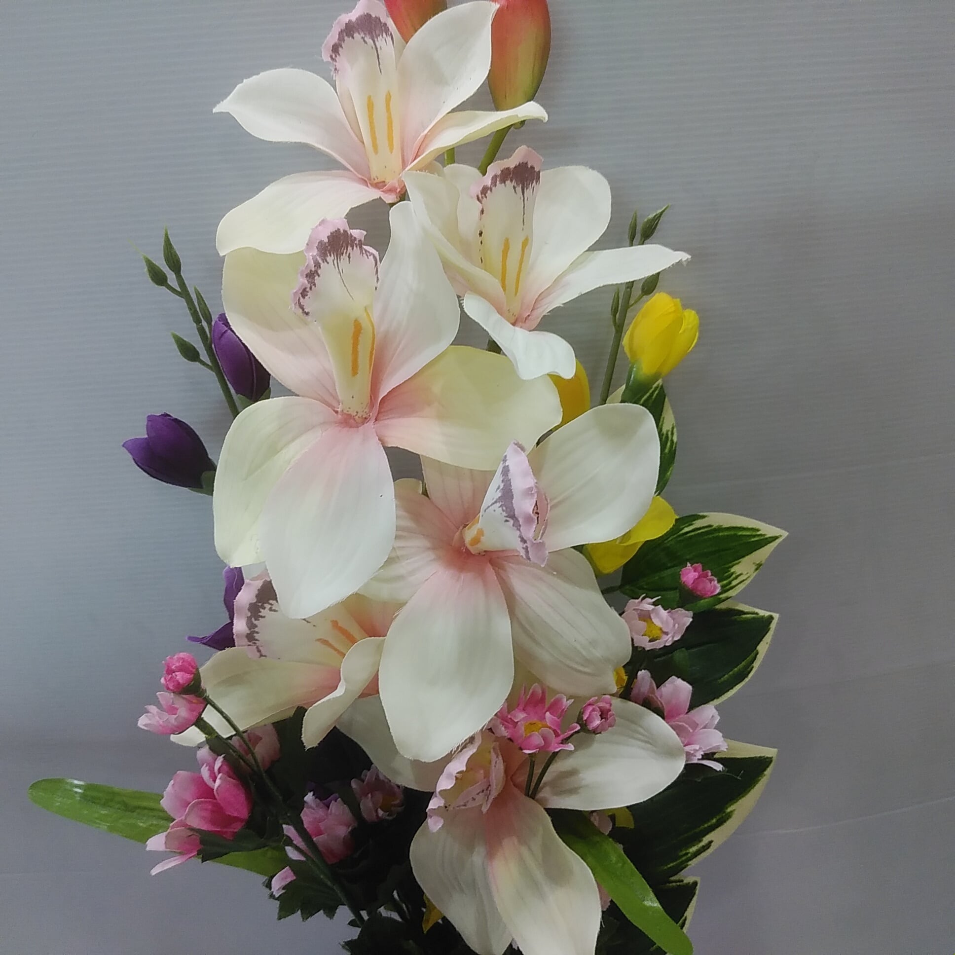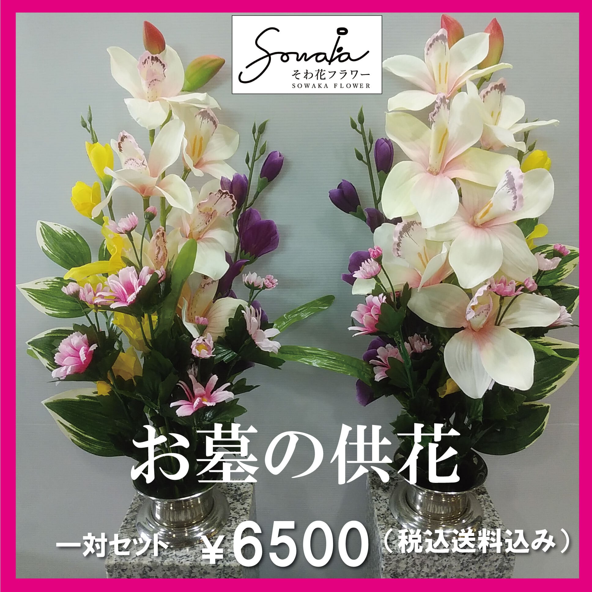 お盆のお墓参りに最適な墓石用のアーティフィシャルフラワー。 生花ではすぐに枯れてしまいますが、造花なら華やかさが保てます。 紫色が印象的な造花の供花1対セットです。 一般的なお墓の花立てにぴったりフィットするサイズです。 ■サイズ:高さ約63cm × 幅約30cm (深さ20~25cmの一般的な花筒にフィット) ■造花種類 5種類