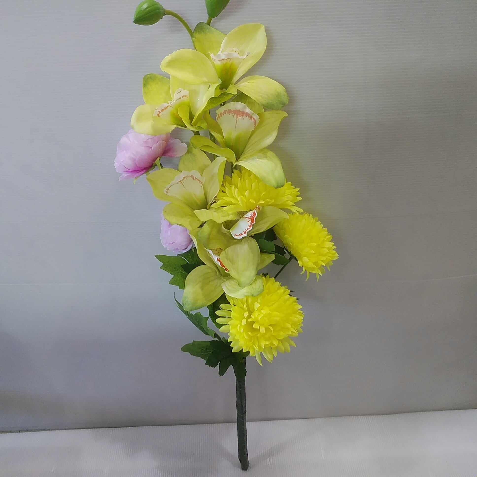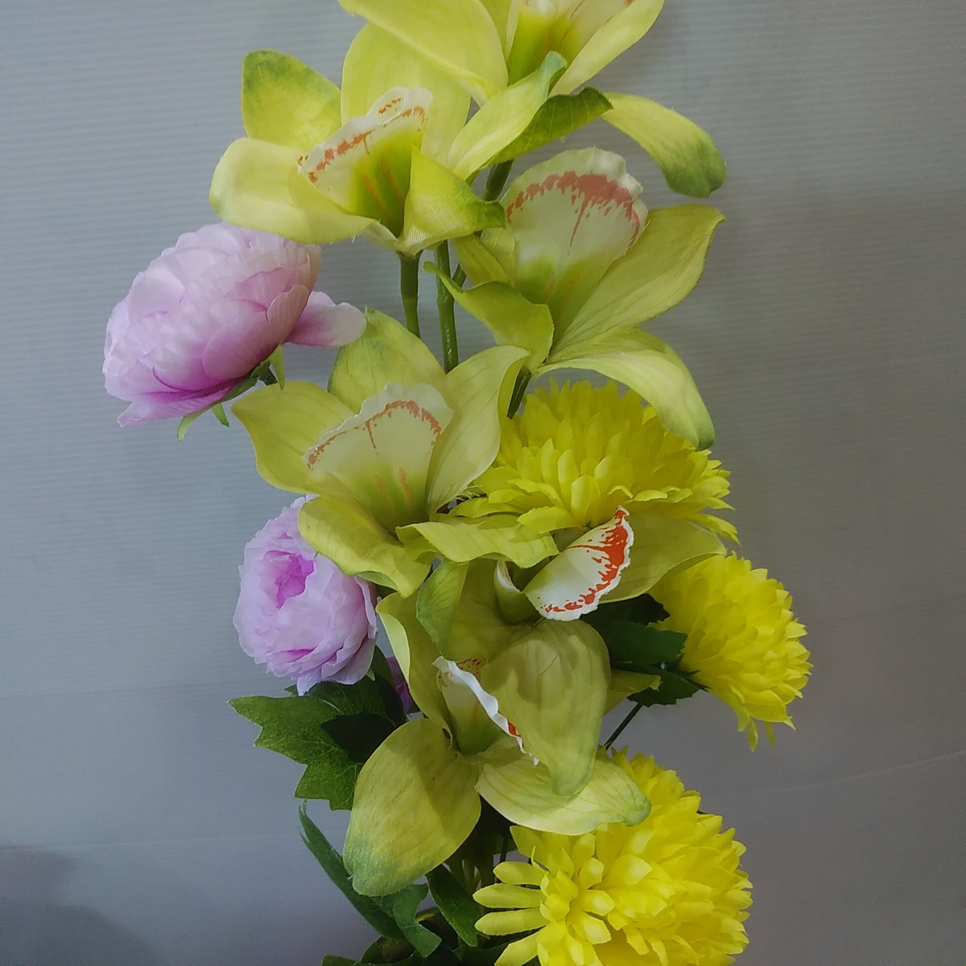 お彼岸のお墓参りに最適な墓石用のアーティフィシャルフラワー。 生花ではすぐに枯れてしまいますが、造花なら華やかさが保てます。 黄色い花が印象的な造花の供花1対セットです。 一般的なお墓の花立てにぴったりフィットするサイズです。 ■サイズ:高さ約63cm × 幅約23cm (深さ20~25cmの一般的な花筒にフィット) ■造花種類 3種類