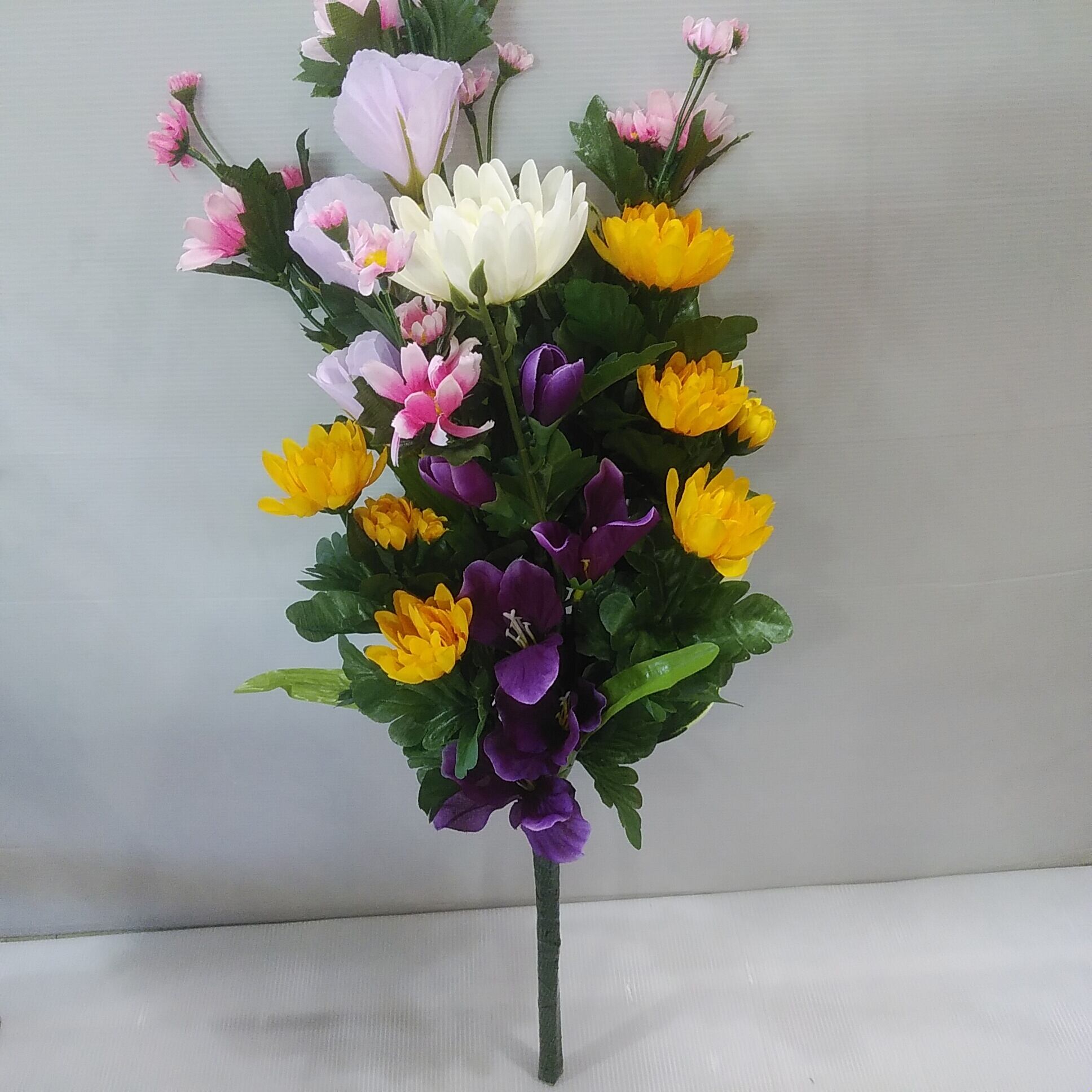お彼岸のお墓参りに最適な墓石用のアーティフィシャルフラワー。 生花ではすぐに枯れてしまいますが、造花なら華やかさが保てます。 黄色い花が印象的な造花の供花1対セットです。 一般的なお墓の花立てにぴったりフィットするサイズです。 ■サイズ:高さ約63cm × 幅約26cm (深さ20~25cmの一般的な花筒にフィット) ■造花種類 5種類