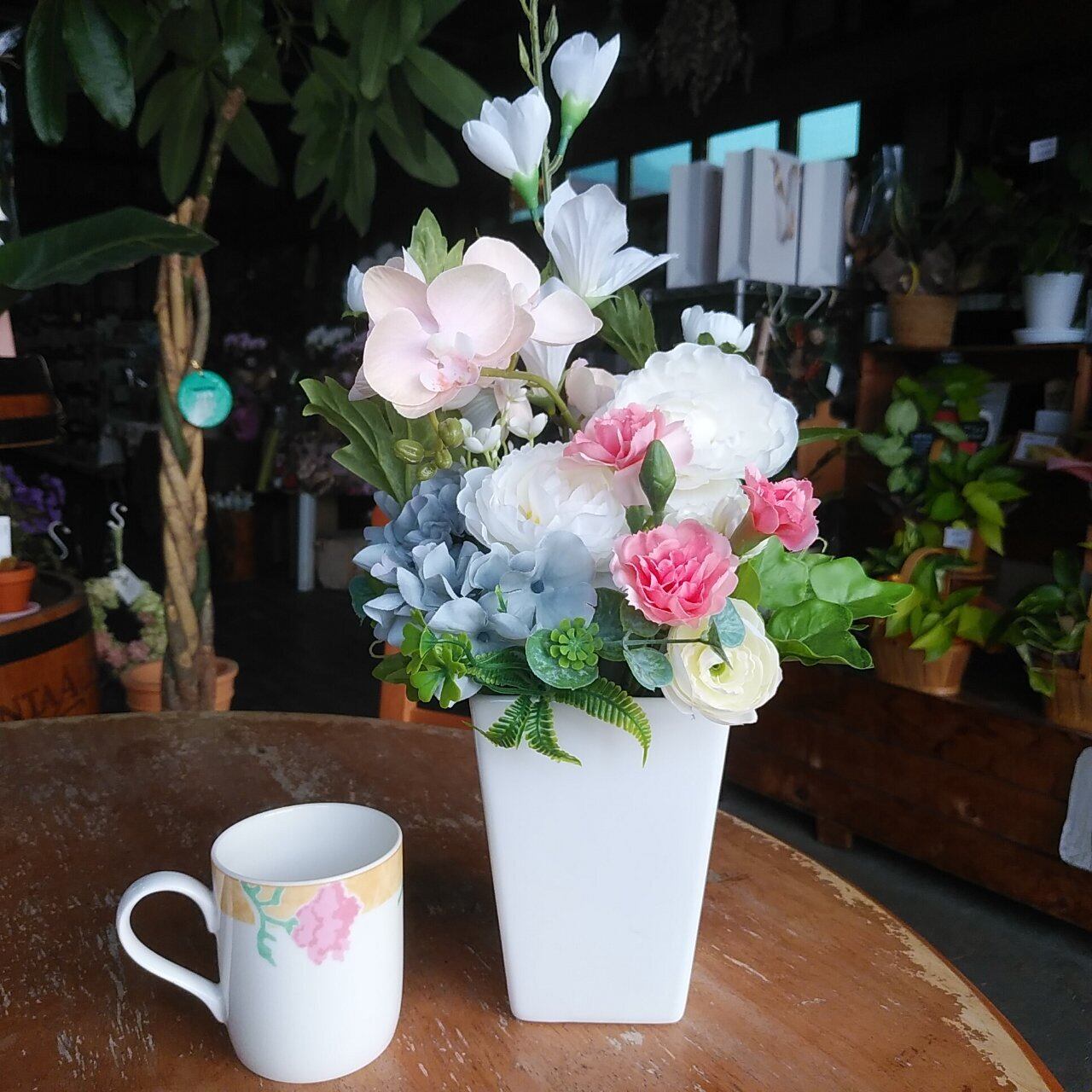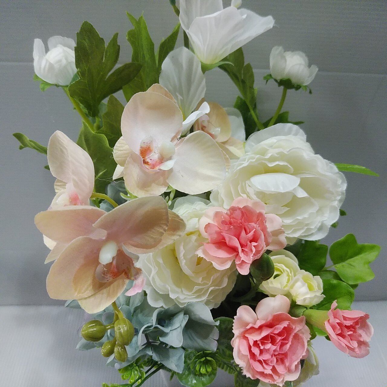 淡い色合いの清楚で落ち着いたアレンジメントです。 晩秋のお仏壇や祭壇によく似合いそうですね。 造花なので枯れることもなく、水換え不要です。ずっと華やかさが保てます。 生花と間違えてしまうくらいのアーティフィシャルフラワーは、 和室・洋室問わず、さまざまなお部屋に違和感なく飾ることができます。 ■サイズ 丈 約43cm 花器高 約14cm 幅約24cm ■ 花材の種類 5種類 ★商品は破損のないように丁寧に梱包して発送しています。