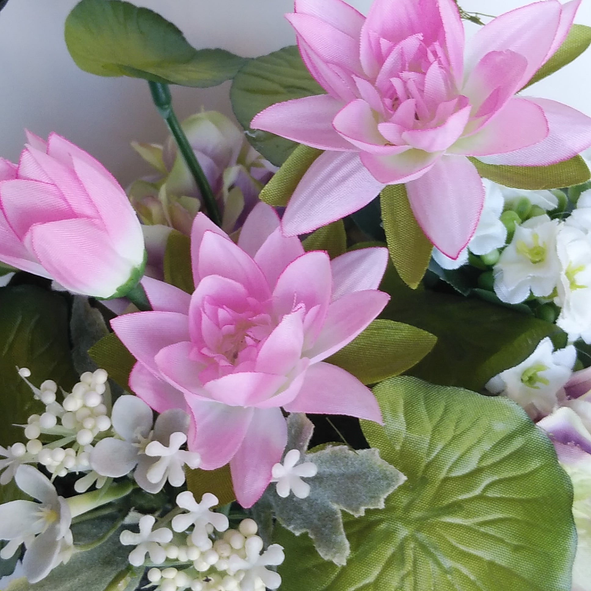 蓮の花がメインのミニアレンジ供え花です。 小さいサイズのお仏壇や飾り棚にそっと飾るだけで 清々しい気持ちにさせてくれそうです。 造花なのでいつまでも楽しめます。 ■サイズ 高さ 約20cm 幅 約18cm ■花材の種類 蓮、あじさい、かすみ草 ★商品は破損のないように丁寧に梱包して発送しています。