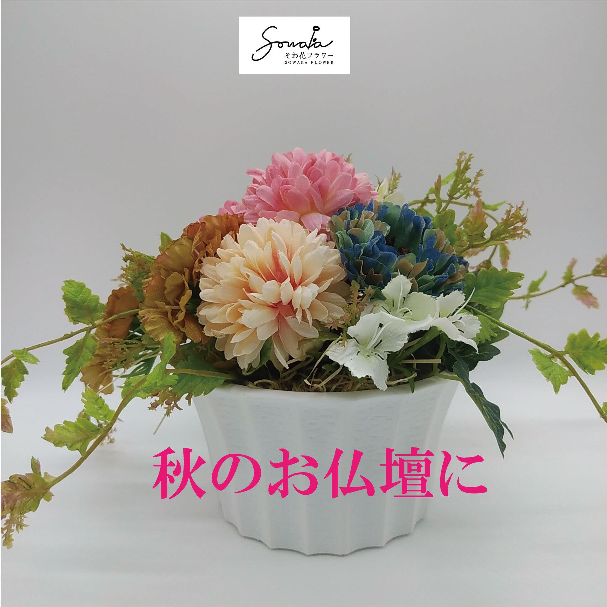 ピンポンマム、スターチス、なでしこ、ヘリクリサムでまとめました。 落ち着きのある穏やかな色合いです。 秋のの御供花にはよろしいかと思います。 一般的なお仏壇や飾り棚にピッタリのサイズです。 造花なのでいつまでも綺麗な花が楽しめます。 ■サイズ 高さ 約16cm 幅 約28cm 花器高 約7cm ■花材の種類4種類 ★商品は破損のないように丁寧に梱包して発送しています。