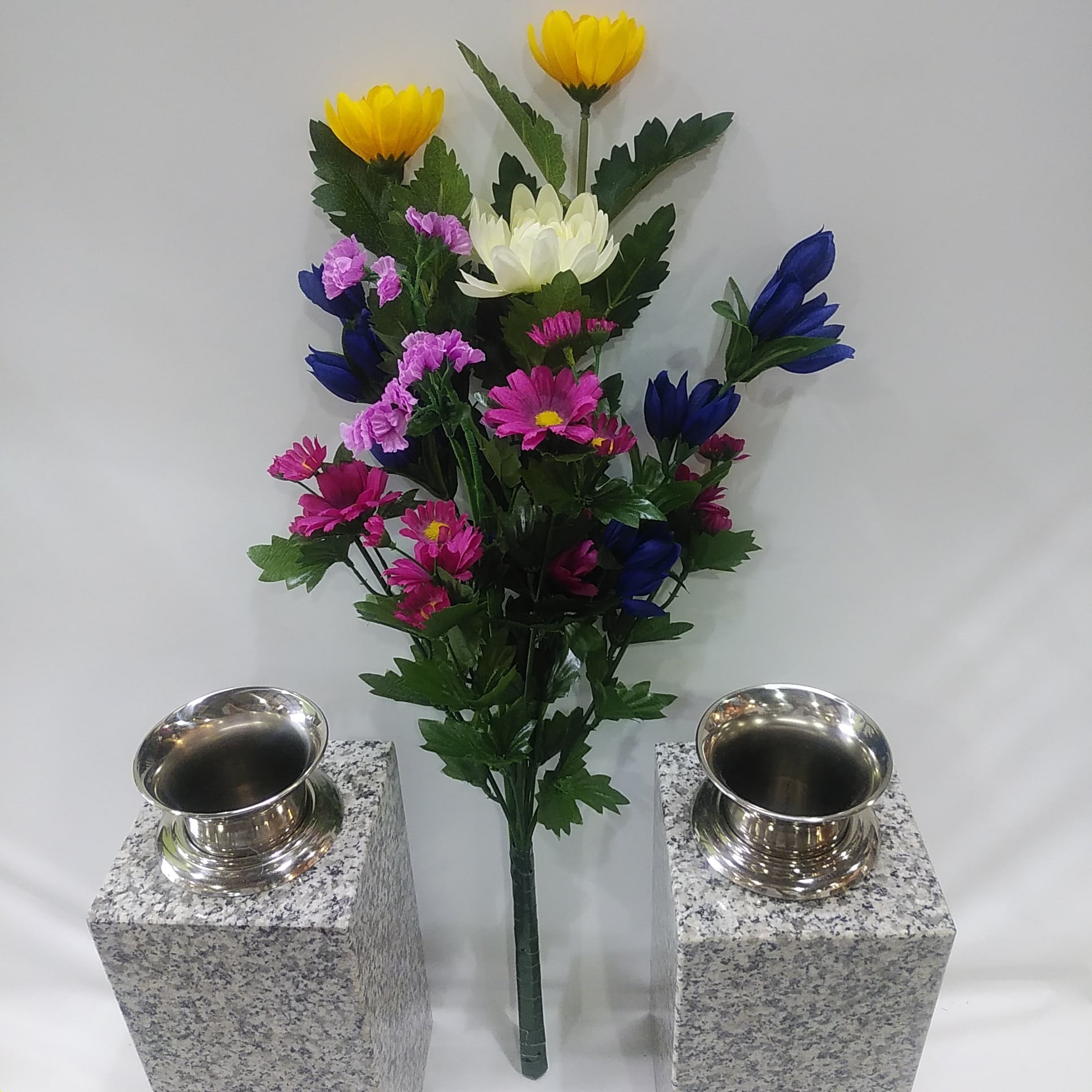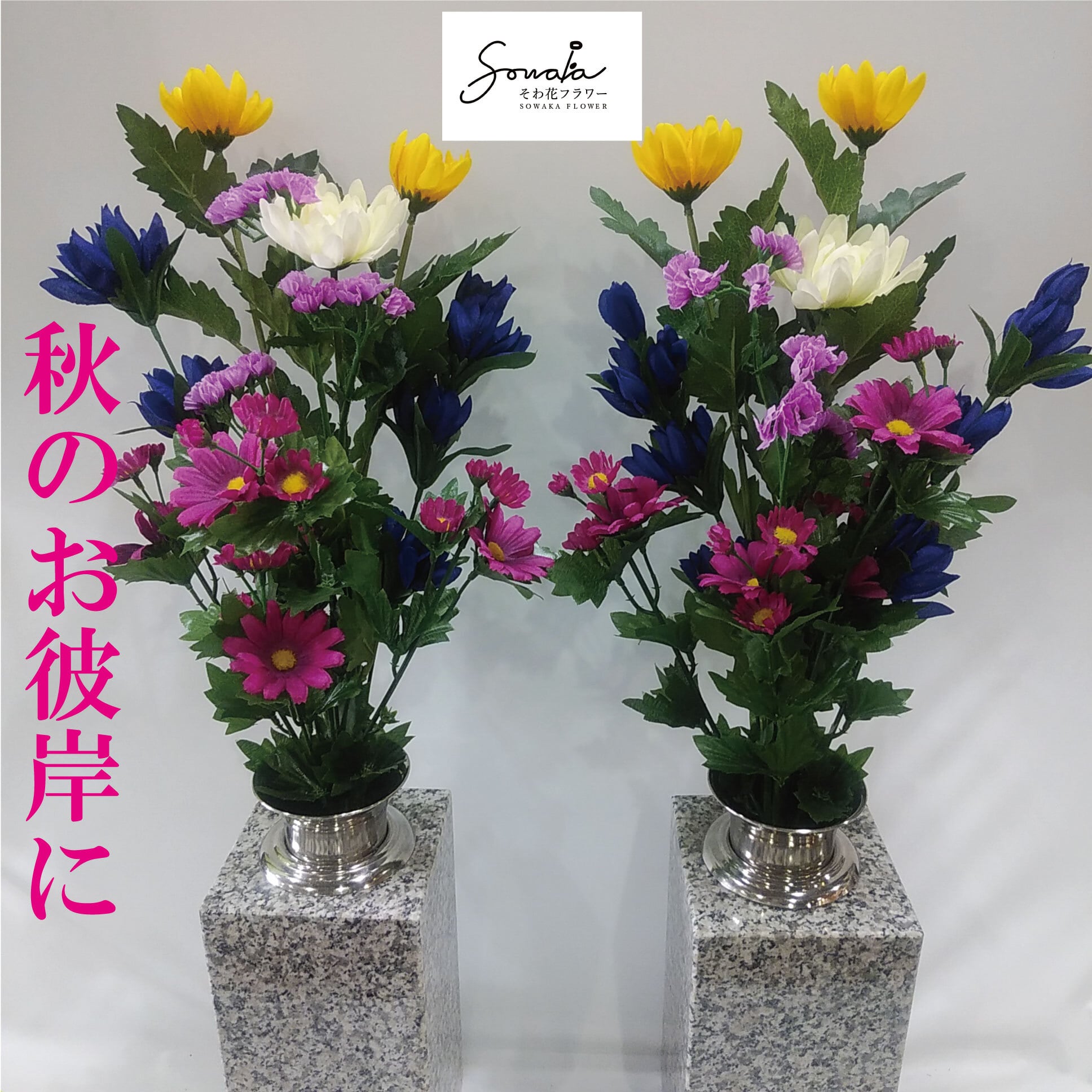 白大菊、黄大菊、スプレー小菊、リンドウ、オーソドックスな組み合わせの 秋のお彼岸に最適なアーティフィシャルフラワー。 生花ではすぐに枯れてしまいますが、造花なら華やかさが保てます。 一般的なお墓の花立てにぴったりフィットするサイズです。 ■サイズ:高さ約60cm × 幅約24cm (深さ20~25cmの一般的な花筒にフィット) ■造花種類 5種類
