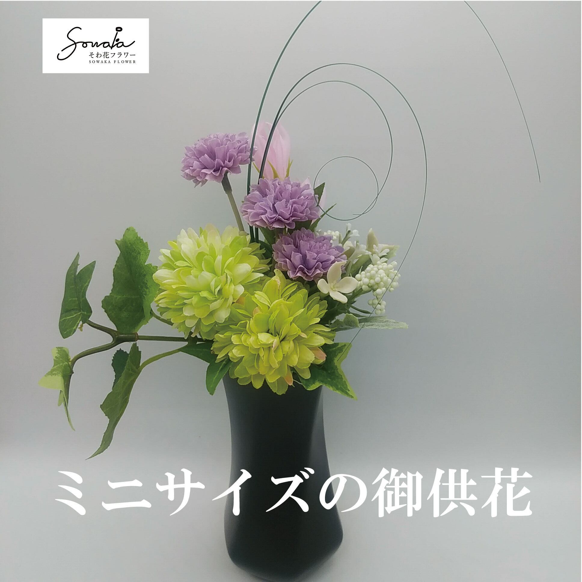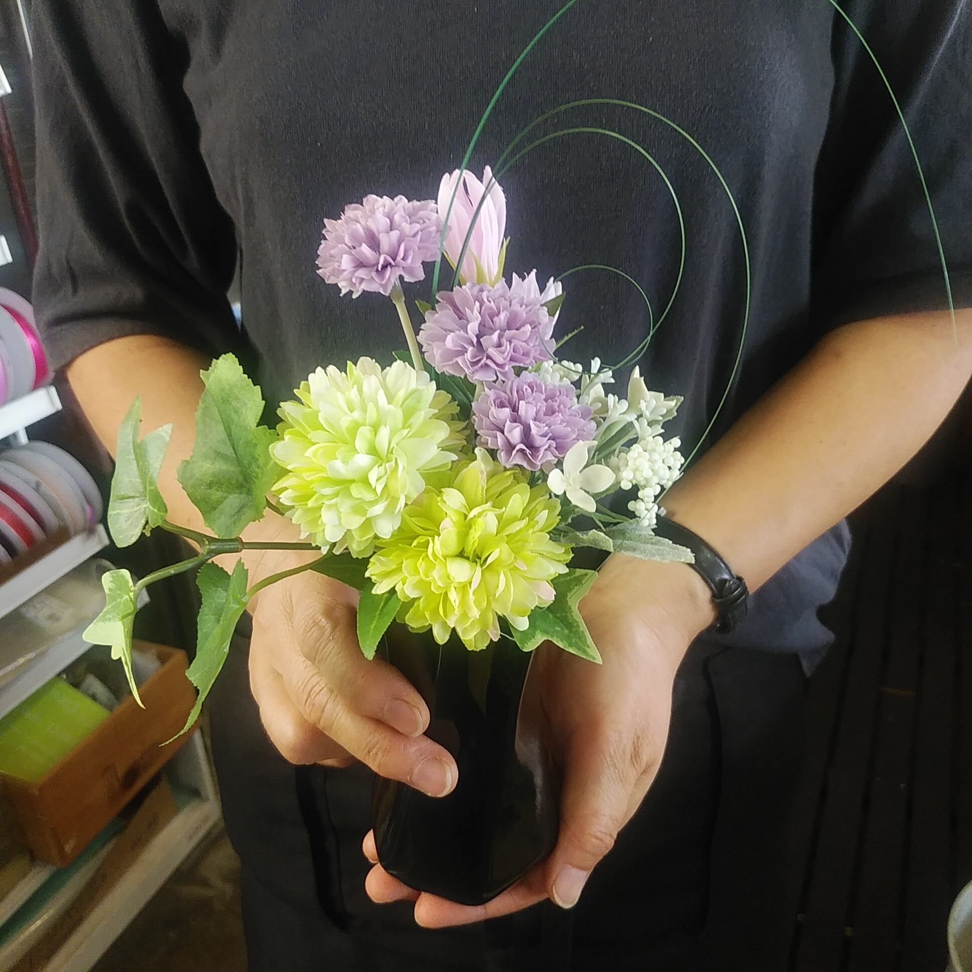 小さな秋の小さな供花。 穏やかで飽きの来ない色彩です。 ミニサイズのお仏壇や飾り棚にピッタリのサイズ! 水替え不要の造花なのでいつまでも綺麗な花が楽しめます。 ■サイズ 高さ 約28cm 幅 約15cm 花器高 約14cm ■花材の種類 4種類 ★商品は破損のないように丁寧に梱包して発送しています。