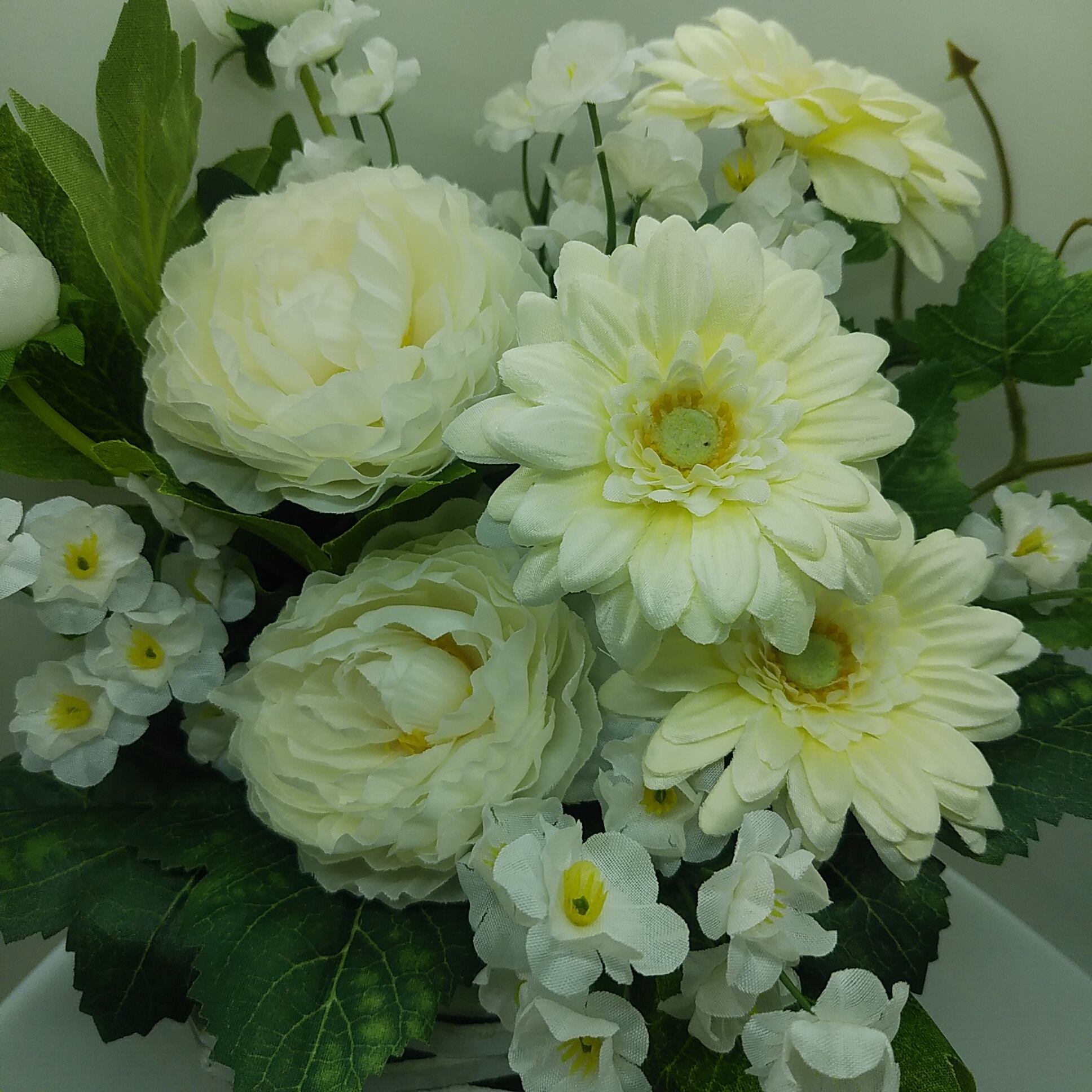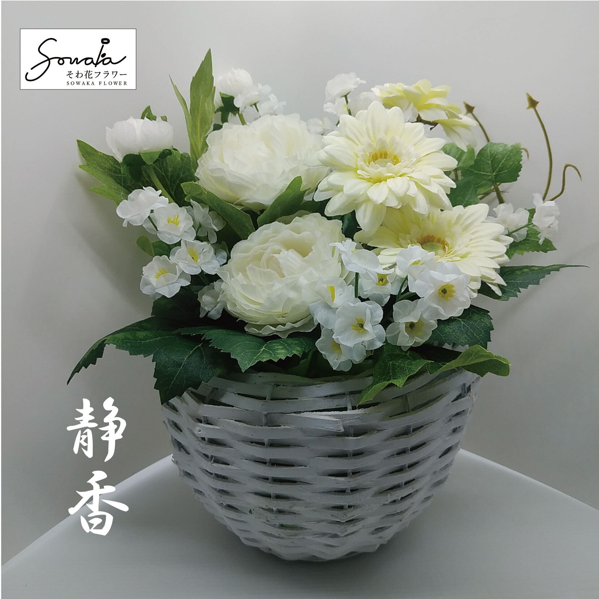 ガーベラとラナンキュラスをメインに 白色でまとめた上品なアレンジです。 ほのかな香りも漂ってきそうな供え花は 年末、年始の御仏壇にも喜ばれます。 水替え不要の造花なのでいつまでも綺麗な花が楽しめます。 ■サイズ 高さ 約26cm 幅 約24cm 花器高 約12cm ■花材の種類 4種類 ★商品は破損のないように丁寧に梱包して発送しています。