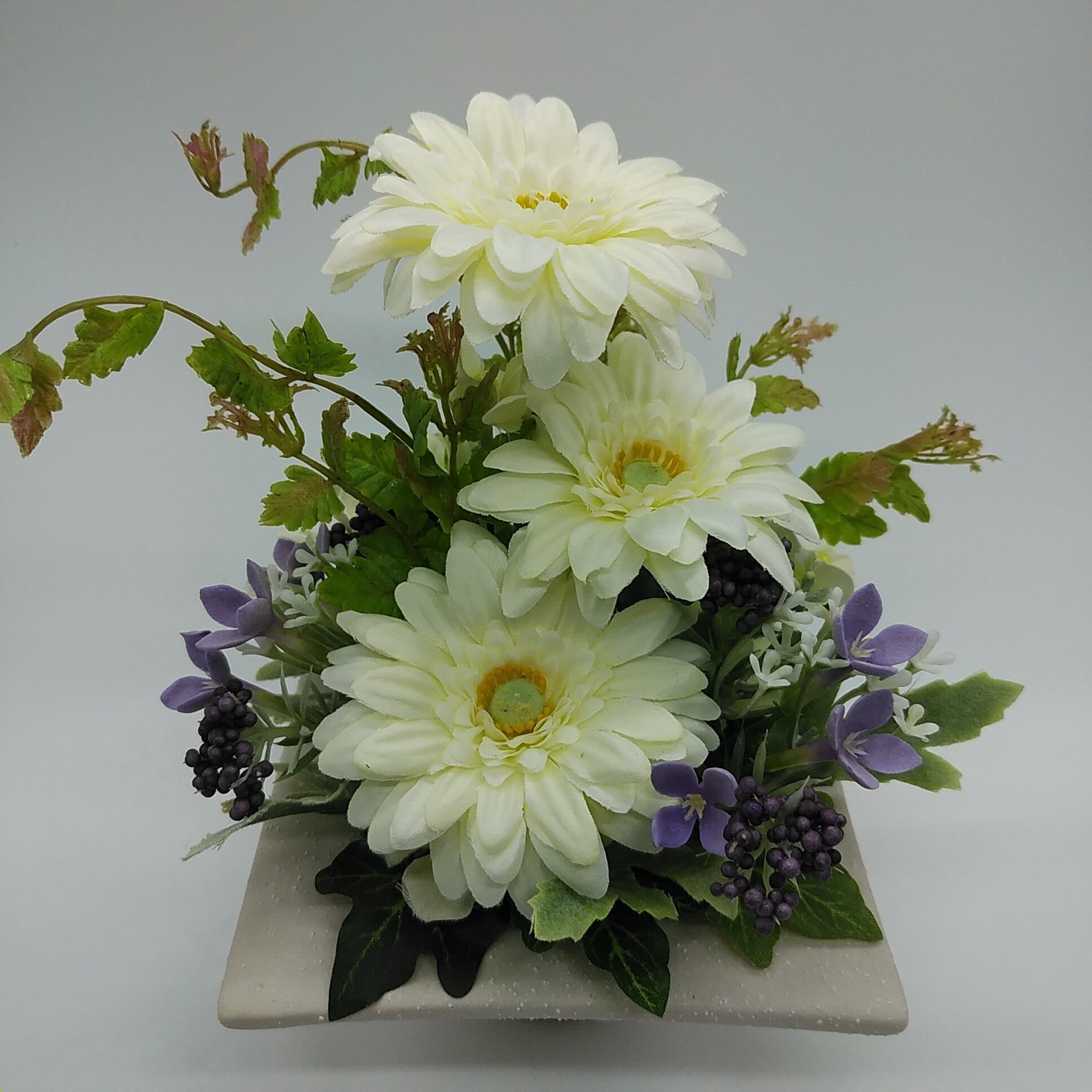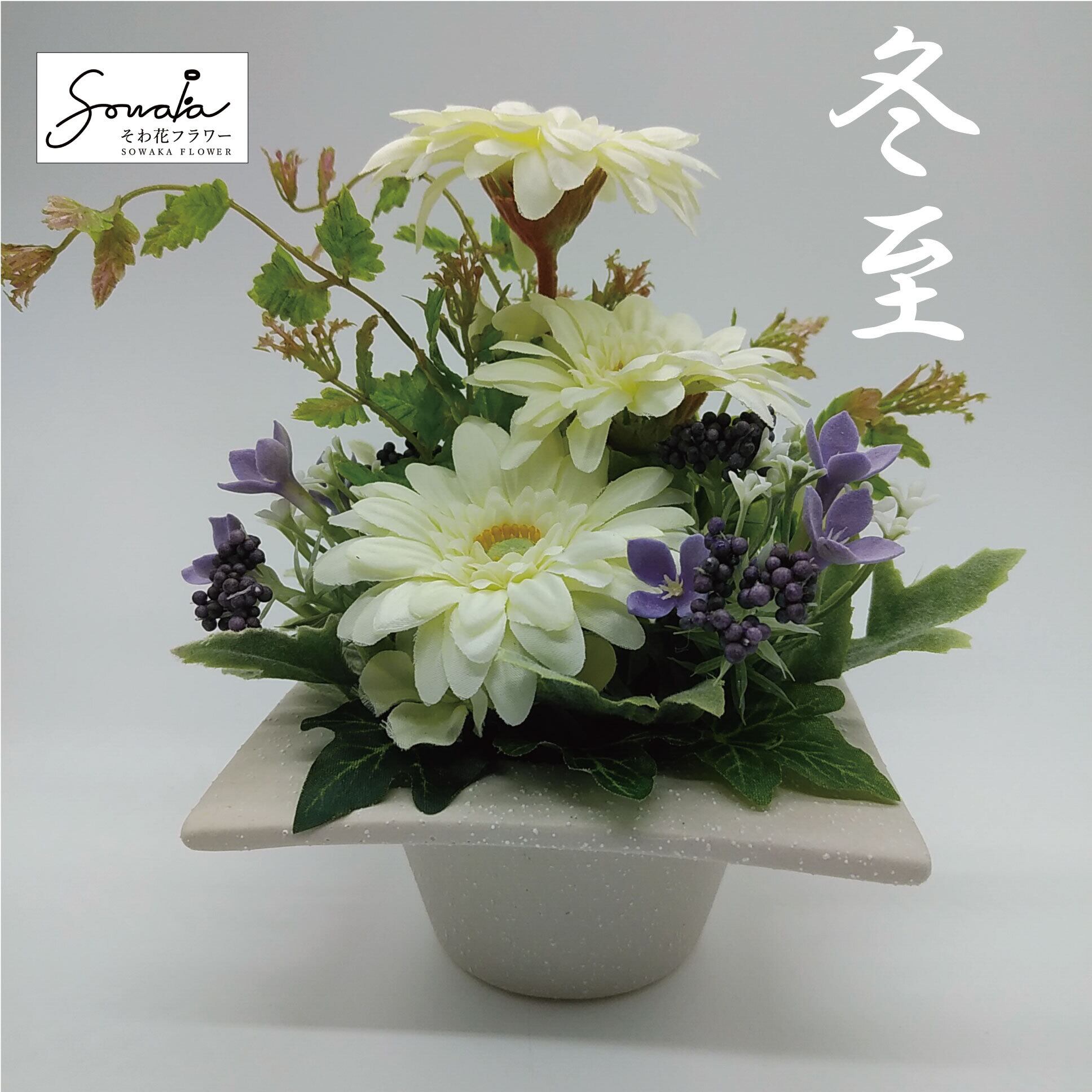 冬至に飾る清潔感のある色彩の供花。 白色ガーベラをメインに忘れな草でアクセント。 ミニサイズのお仏壇や神棚、飾り棚にピッタリのサイズ! 水替え不要の造花なのでいつまでも綺麗な花が楽しめます。 ■サイズ 高さ 約18cm 幅 約18cm 花器高 約5cm ■花材の種類4種類 ★商品は破損のないように丁寧に梱包して発送しています。