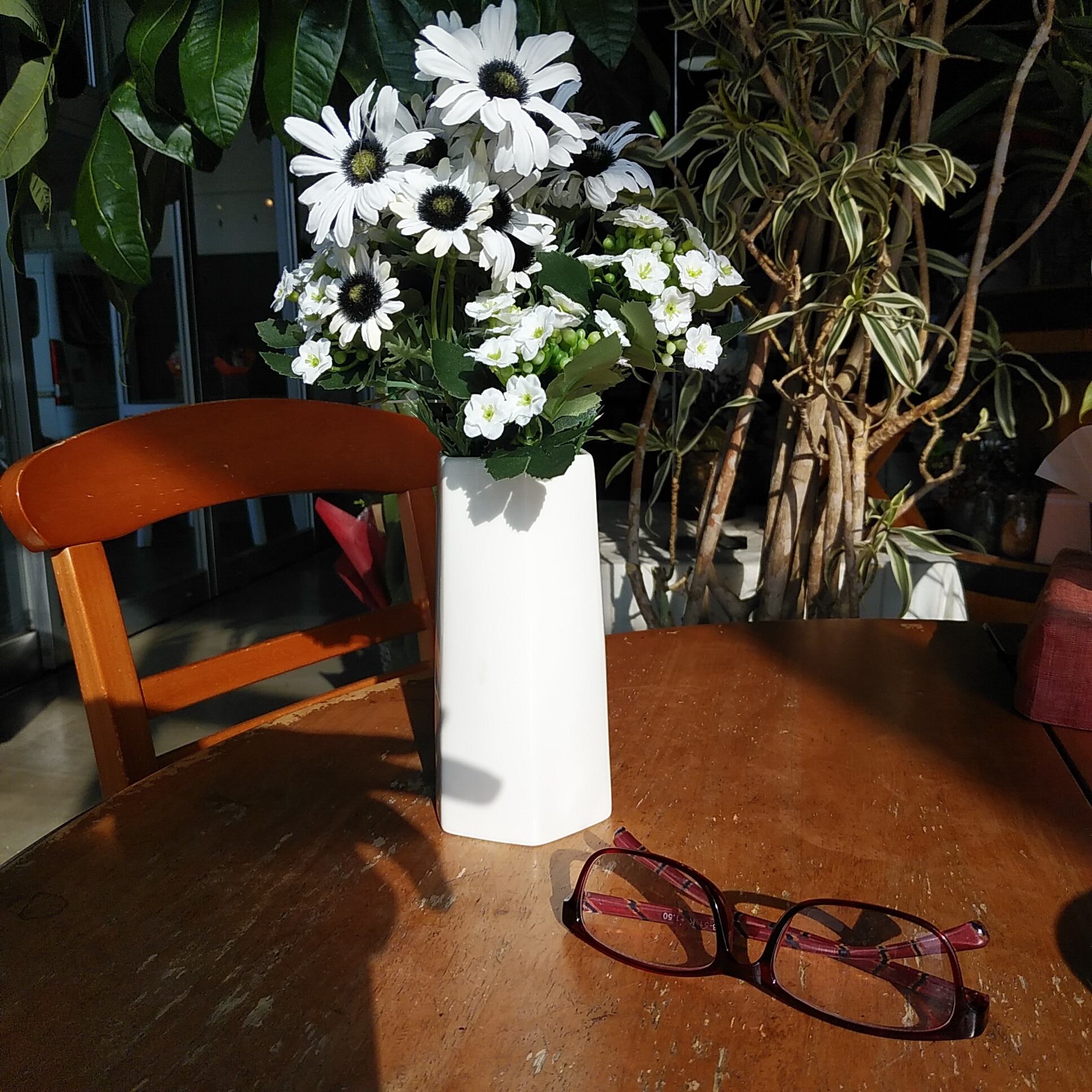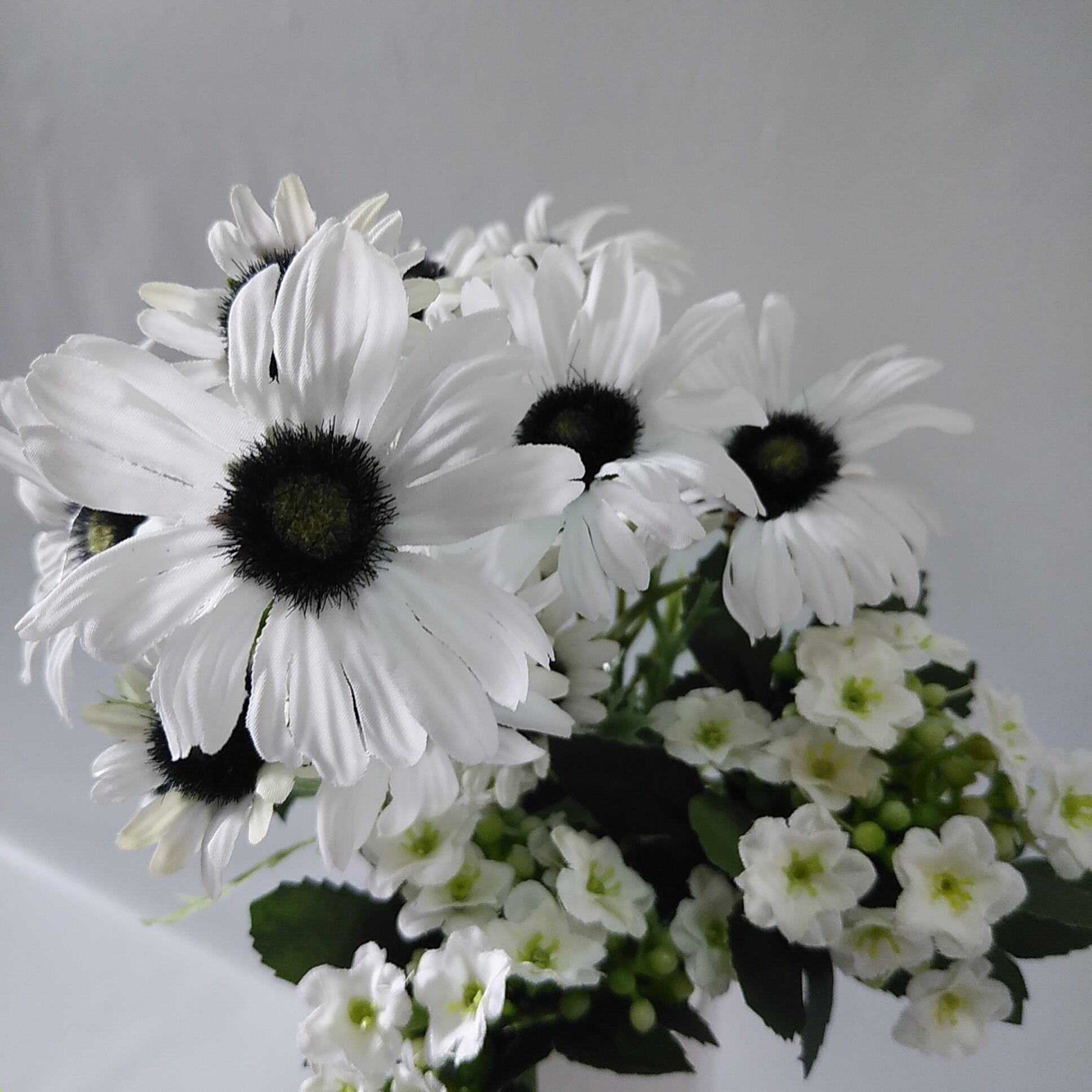 お正月も終わって静かな日常生活に戻りましたね。 マーガレットと忘れな草のシンプルなアレンジです。 白い花器と白い花は木目調の仏壇や飾り棚にも映えます。 玄関先に飾っても違和感はありません。 造花なのでいつまでも綺麗な花が楽しめます。 ■サイズ 高さ 約24cm 幅 約18cm 花器高 約16cm ■花材の種類 2種類 ★商品は破損のないように丁寧に梱包して発送しています。