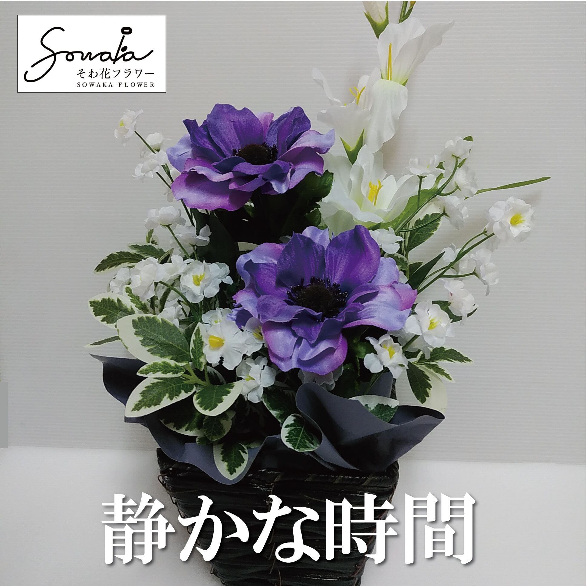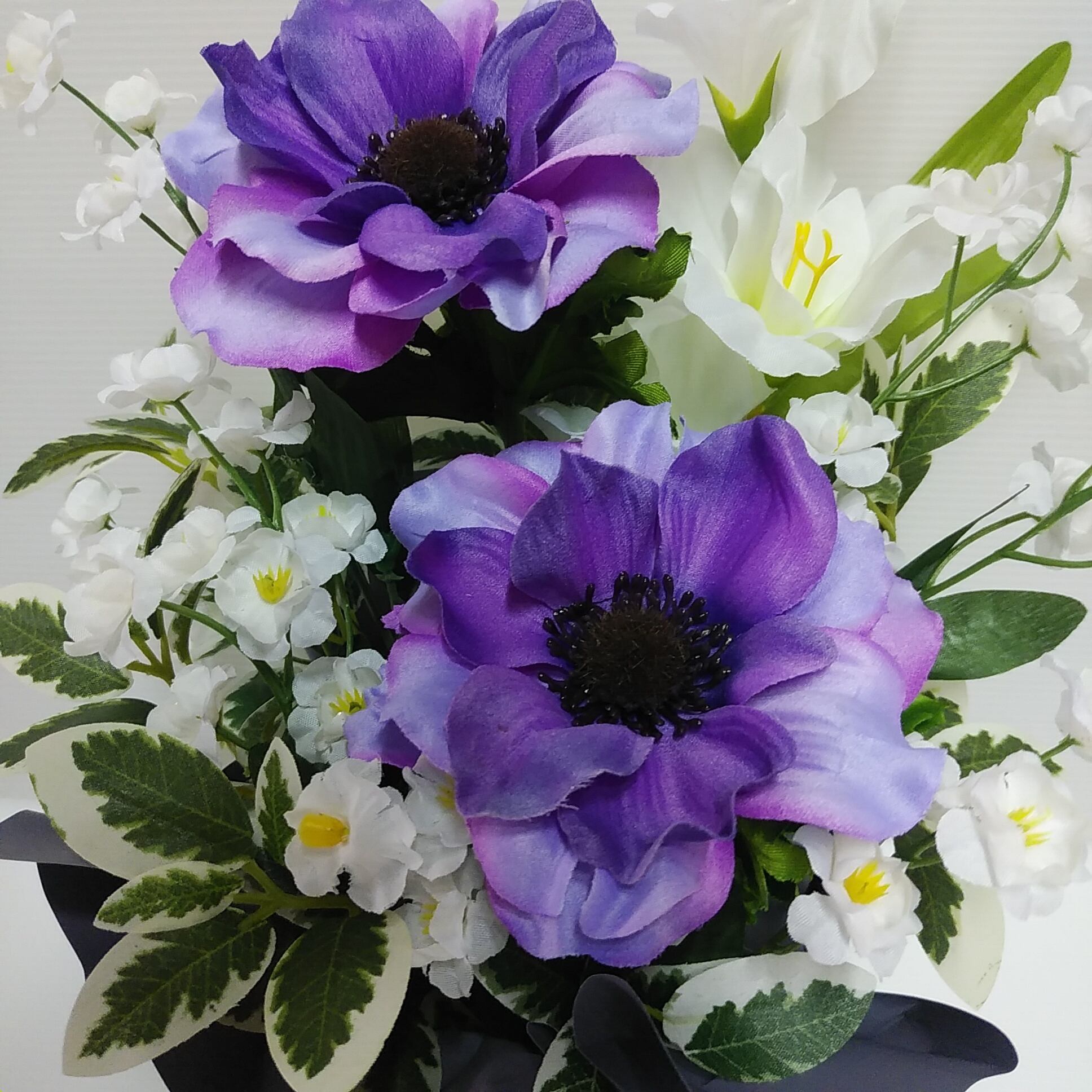 お正月も終わって静かな日常生活に戻りましたね。 紫アネモネ、白いグラジオラス、忘れな草のシンプルなアレンジです。 黒い編み花器にしっくりとした色合いで仏壇や飾り棚にも映えます。 玄関先に飾っても違和感はありません。 造花なのでいつまでも綺麗な花が楽しめます。 ■サイズ 高さ 約42cm 幅 約24cm 花器高 約10cm ■花材の種類 3種類 ★商品は破損のないように丁寧に梱包して発送しています。