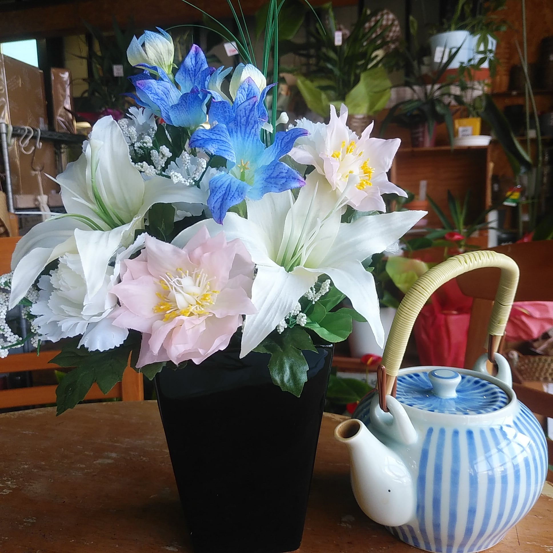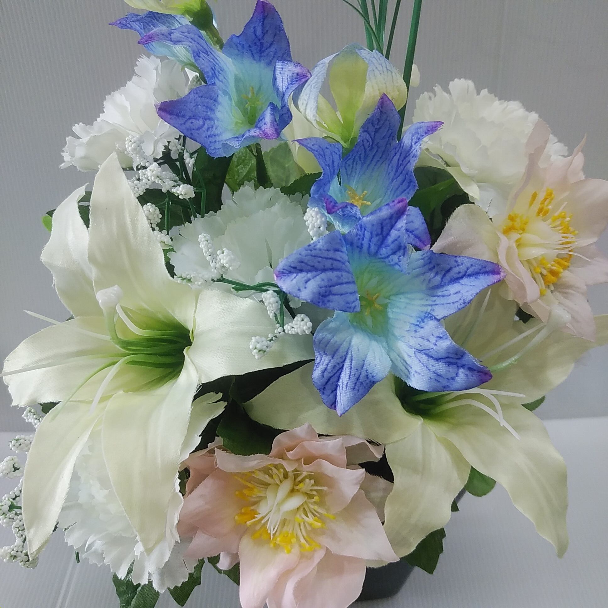 あっという間に4月。これから気温もどんどん上昇しますね。 白ユリをメインにした気軽に飾れる花器付きアレンジメント。 涼しげなな色合いで春の御仏壇にも似合います。 プレゼントとしても大変喜ばれております。 ■サイズ 高さ 約40cm 幅 約24cm 花器高 約15cm ■花材の種類 5種類 ★商品は破損のないように丁寧に梱包して発送しています。